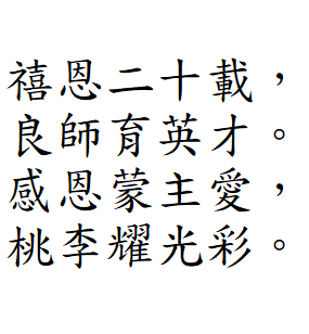 禧恩小學二十載 天天笑聲多歡暢 上帝教導隨心載 叫你我展翅 暢遊星海